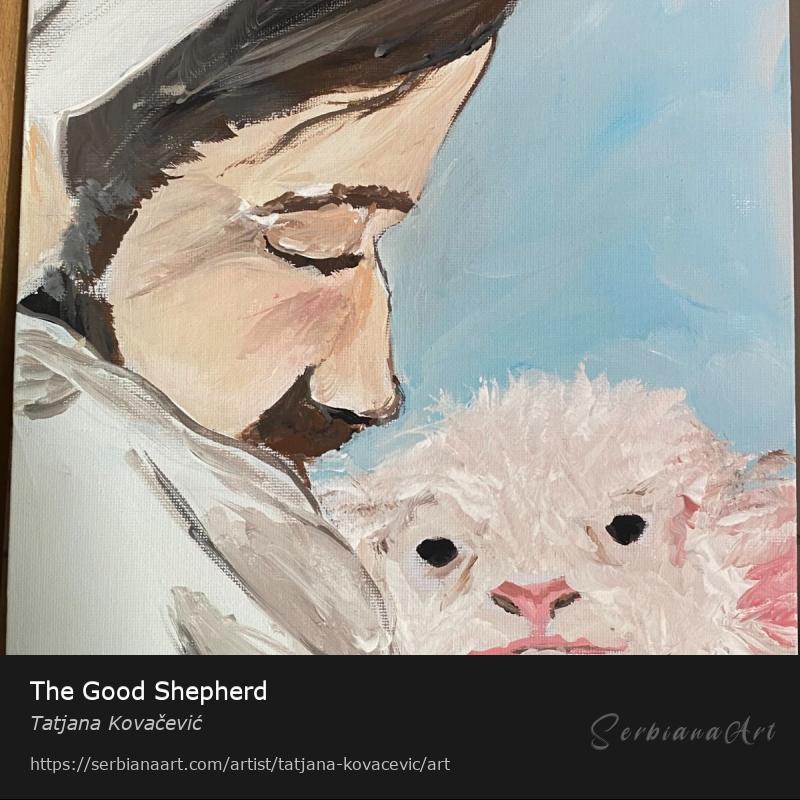 This gentle and emotional painting portrays Christ as the Good Shepherd, lovingly holding a lamb in His arms. Inspired by the biblical verses John 10:11 and Isaiah 40:11, the artwork speaks of divine care, protection, and grace. Expressive brushstrokes and soft tones reflect a spiritual calm and the tender presence of God's love.
