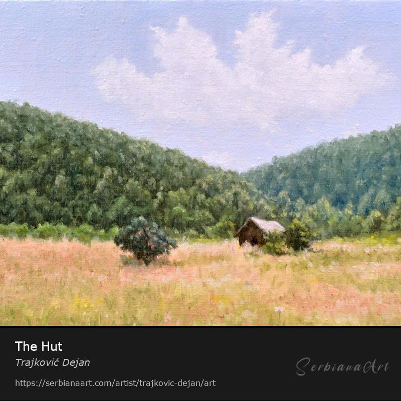 Old hut on the meadow. Many of us dream of fleeing to such a place and a simple life in nature. Original oil painting on linen canvas. Painted using high quality oil colors. Framed and ready to hang.Share and promote this artwork