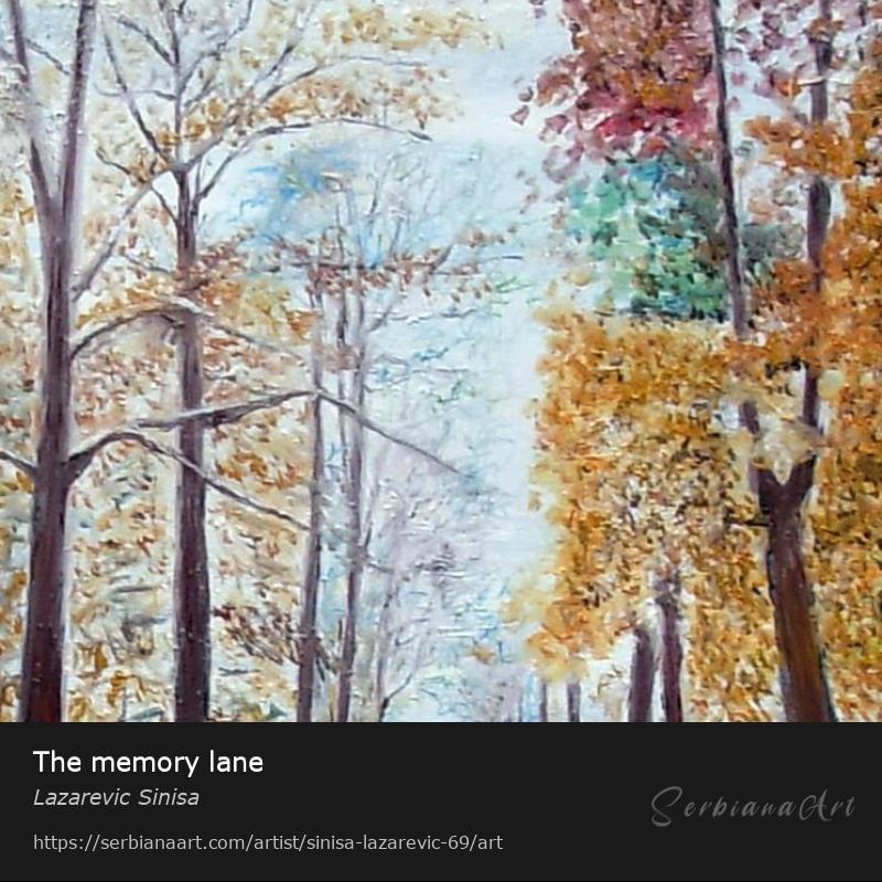 This impressionistic composition depicts an idyllic autumn scene, in which trees with fallen leaves frame a long, straight path that is lost in the haze of the distance. The color accent is placed on the wealth of autumn tones - golden yellow, orange and dull red, while the sky carries transparent light, gently reflected on the bare branches of the trees. The texture of the paint adds vibrancy and depth, while the perspective construction creates the illusion of movement towards the center of the composition.