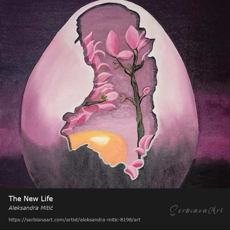 The painting "The New Life" symbolically represents the birth of a new beginning and the power of nature. Through the motif of a flower growing from a cracked egg and the warm tones of purple and gold, the artwork conveys a message of hope, renewal, and creation.