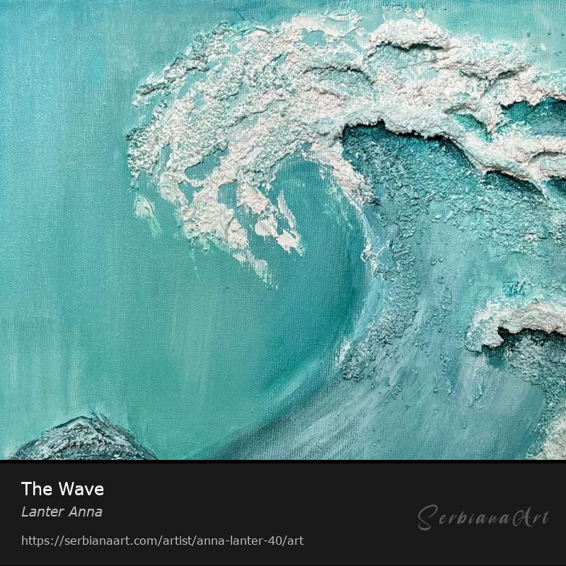 The wave is made with texture paste on a blue-green background.Share and promote this artwork