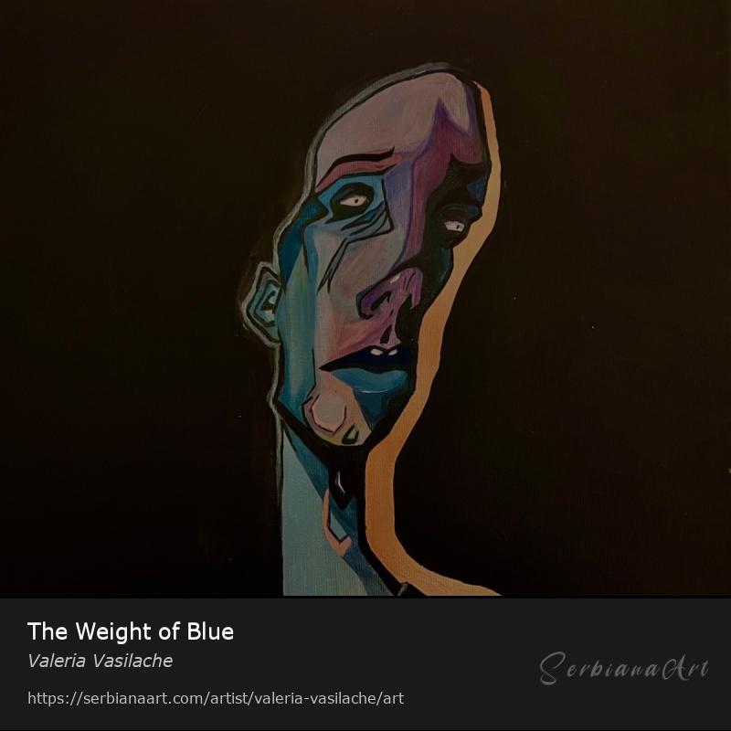 This piece, "The Weight of Blue" is a striking acrylic work on canvas characterized by its expressionistic style and dramatic use of light and color. The elongated, distorted figure emerges from a stark black background, illuminated by an unseen, intense source. The cool, almost sickly blues and purples used for the face and neck evoke a sense of deep melancholy, introspection, or emotional strain. The sharp, angular lines and pronounced shadows emphasize the figure's gauntness and the weight of their expression. A contrasting warm, gold-orange light outlines the figure's right side, creating a powerful halo effect and further emphasizing the dramatic tension between light and shadow, and perhaps, inner turmoil and outward appearance. The stark vertical lines across the lower part suggest a cage or a striped garment, adding to the theme of confinement or structure.