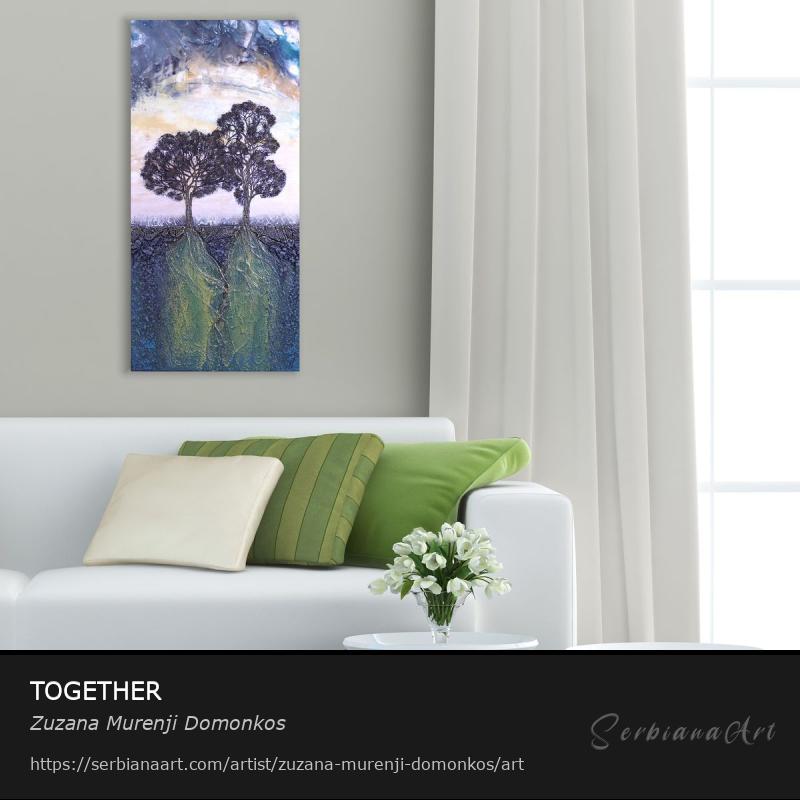 TOGETHER ... this painting symbolizes togetherness????... the intertwined roots represent the unbreakable unity.???? With its rich texture and bright colors, the painting will be a real jewel on the wall of your home. I don't want to sleep alone, breathe alone, create alone, exist alone, feel alone. Who you need, you need with your strengths and weaknesses. I want to merge with your breathing. For eternity. So that you don`t let me go anymore... Kata Tisza MEDIUM: acrylic paint on canvas-mixed media GALLERY CANVAS: the canvas is stretched over the wooden support frame: it completely covers the stretcher bars and is stapled on the back SIDES: the sides of the picture are also painted, so they can be hung without a frame SIGNATURE: on the back of the painting ONE OF A KIND ARTWORK: supplied with Certificate of Authenticity READY TO HANG (umframed) VARNISH: UV brilliant varnish is applied against fade caused by light SHIPPING: it will be delivered after obtaining the necessary documents for export (5-7 working days). Once the painting is shipped, you will receive an email with your tracking details and the expected delivery date.