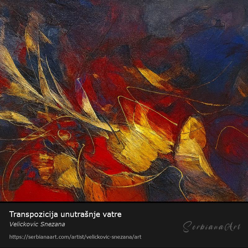 This abstract composition in vibrant reds, golds, and navy explores the conflict between inner passion and silence. The center of the painting pulses with heat—like an explosion of inner strength—while cool blues balance and suggest depth and peace in the background. The gold breaks through like cracks of light, suggesting spirit, will, and light in the darknes