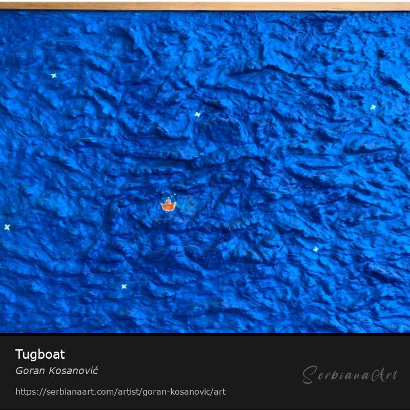 The painting was made using putty, glue, and acrylic paints. The painting depicts a tugboat pulling three hearts. The painting weighs 10 kg. It was created in 1998 and was exhibited at the Zvono Gallery (1999) and the Museum of Yugoslavia (2012) in Belgrade.