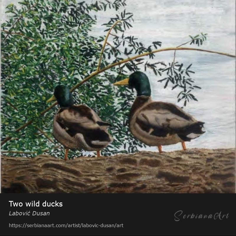 Naturalistički prikazan par divljih pataka na starom deblu koje delimično zaklanja šiblje.U drugom planu pogled na vodu.