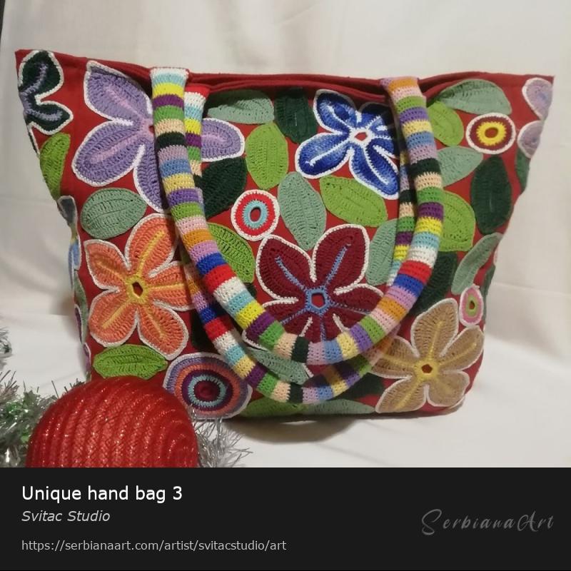 Unique, handmade cotton hand bag with crouched flowers and leaves. Has a lining, an inner pocket and a zipper closure. Colour: redShare and promote this artwork