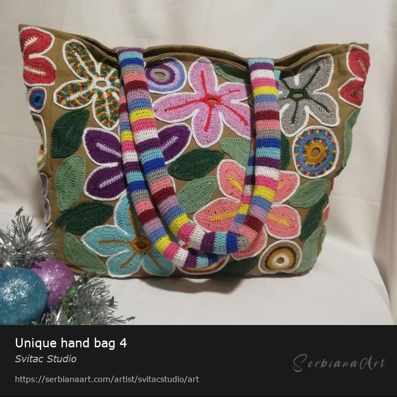 Unique, handmade cotton hand bag with crocheted flowers and leaves. Has a lining, an inner pocket and a zipper as closure. Colour: lightbrownShare and promote this artwork