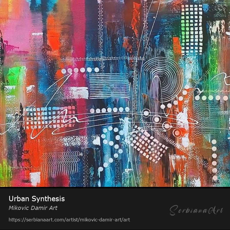 "Urban Synthesis" is a dynamic abstract painting that evokes the energy and rhythm of a modern city through vivid colors and layered details. Using a combination of oil and acrylic on canvas measuring 140x80 cm, the artist creates a rich composition of textures and shapes, where colors collide and pass into each other, reminding of the contrasts and movements in the cityscape. White lines and dotted patterns emphasize the harmony of the chaotic, while vibrant tones add a sense of liveliness and movement. It is ideal for modern spaces, bringing a touch of urban energy and dynamism.