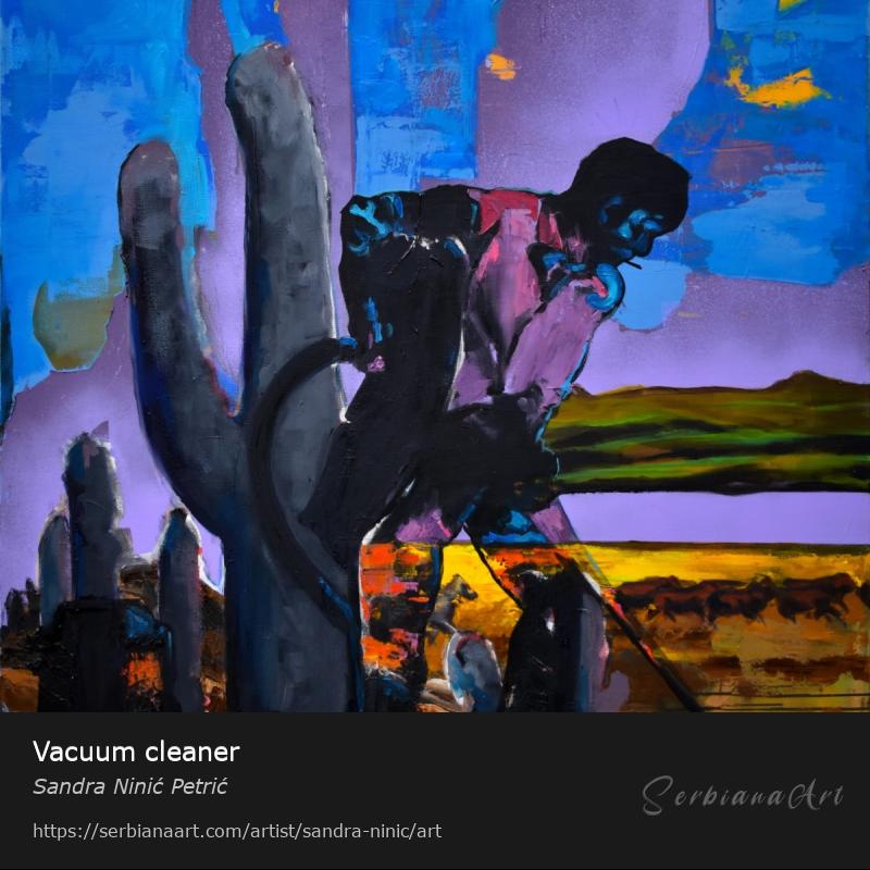 The "vacuum cleaner" with the static central figure invites a symbolic interpretation where the possibilities of understanding are unlimited. The playful, mystical atmosphere draws the viewer in to look for all the hidden details that fuel the imagination of a potential event.