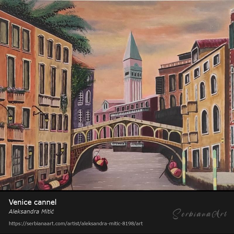 The painting “Venice Canal” depicts a canal in Venice with gondolas, historic buildings in warm tones, and a bridge. The theme evokes a sense of travel, nostalgia, and Mediterranean atmosphere, while the rich color palette and carefully shaped architectural lines give the piece its decorative and aesthetic strength.