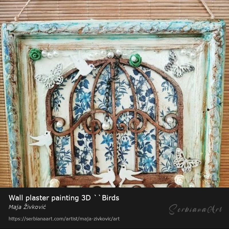 Wall plaster painting 3D ``Birds'', combined with wooden ornaments, birds and beads...