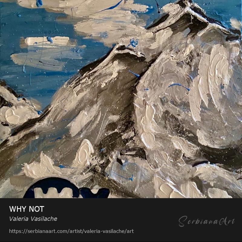 "WHY NOT?" is a bold, mixed-media work that merges the dramatic power of a natural landscape with a disruptive piece of urban graphic art. The background is a fiercely textured, expressionistic depiction of a snow-capped mountain range under a dynamic blue sky with scattered clouds. The artist uses heavy impasto—thick, sculptural layers of acrylic paint—to build up the rugged terrain, conveying the cold, immense, and unyielding nature of the high peaks. The color palette is dominated by stark whites, cool greys, and vibrant blues, suggesting a raw and intense wilderness.