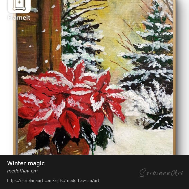 Discover an artistic masterpiece that brings the warmth and peace of winter into your home! This original painting, made with acrylic paints on canvas, depicts a wonderful winter scene: a red poinsettia in a brown bowl stands proudly on a snowy windowsill, while pine trees covered in the whiteness of snow can be seen through the window. The warm yellow tones of the background create a warm contrast with the cold winter atmosphere, and the lively brush strokes add depth and emotion. Inspired by expressionism and impressionism, this painting brings a poetic experience of snow and light, perfect for lovers of art and the beauty of nature.