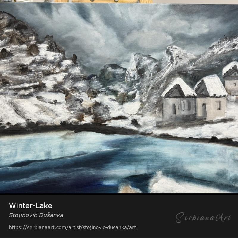 Inspired by the picture I saw, I created a work on canvas with my own hand. A beautiful lake surrounded by mountains in winter. The art painting is my personal work with French-made acrylic paints.