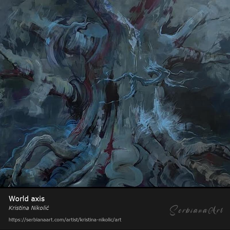 “World axis (Night of Svarog/Kali Yuga)”, 140x200, serves as a cosmic axis, connecting different realms or levels of existence. It represents the interconnectedness of the physical world, the heavens and the underworld. Night of Svarog is characterized by an increase in spiritual ignorance, moral decline, and societal chaos, an age of darkness, materialism, and spiritual degradation.